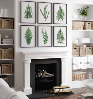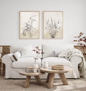 A gallery wall of six botanical illustrations showcasing various wildflowers in black ink on a vintage-inspired tan background. The artwork is displayed in a living room setting with a plush sofa and natural light.